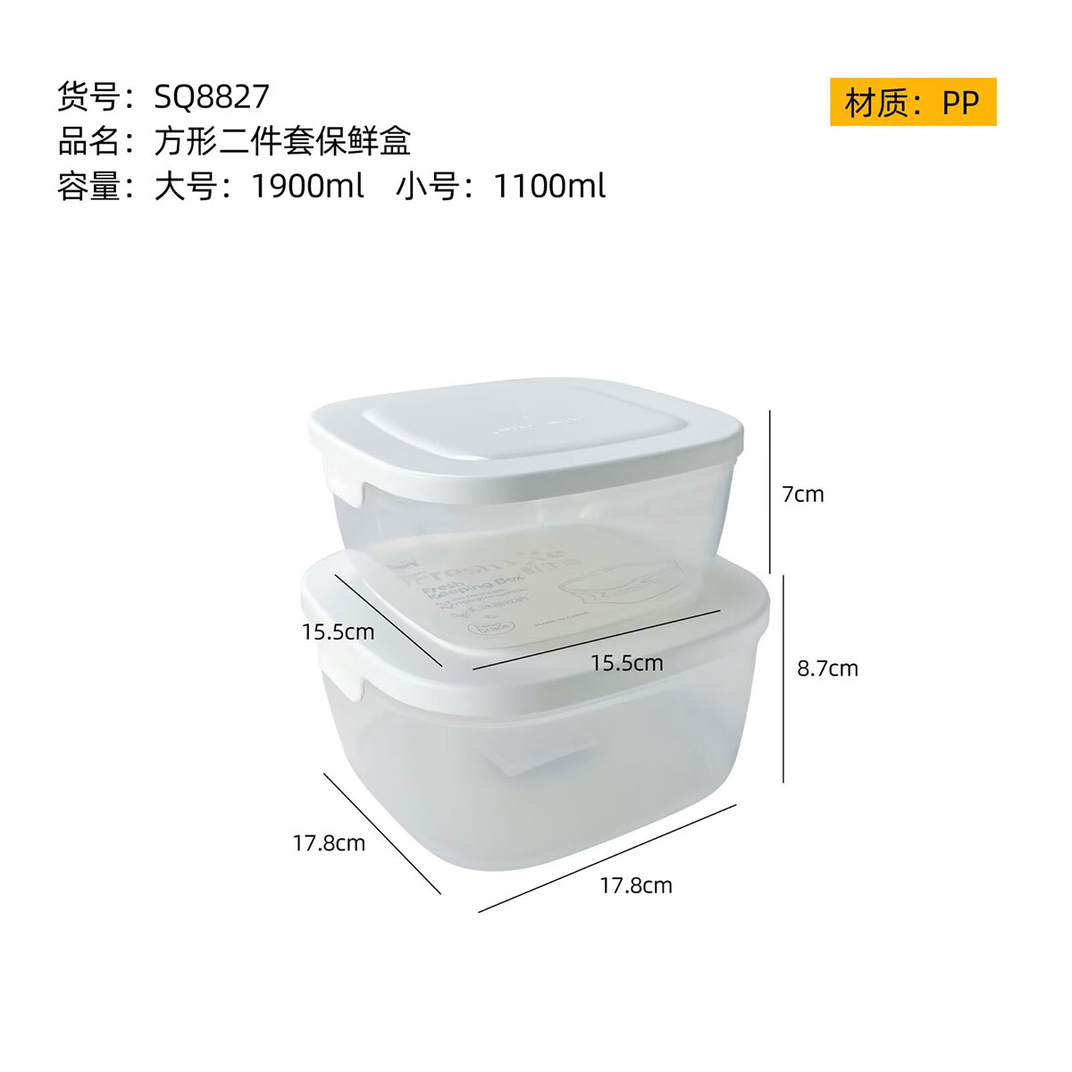 Size: SQ-8827(二件套):中號:155*155*70mm/1100ml 大號:178*178*87mm/1900ml
