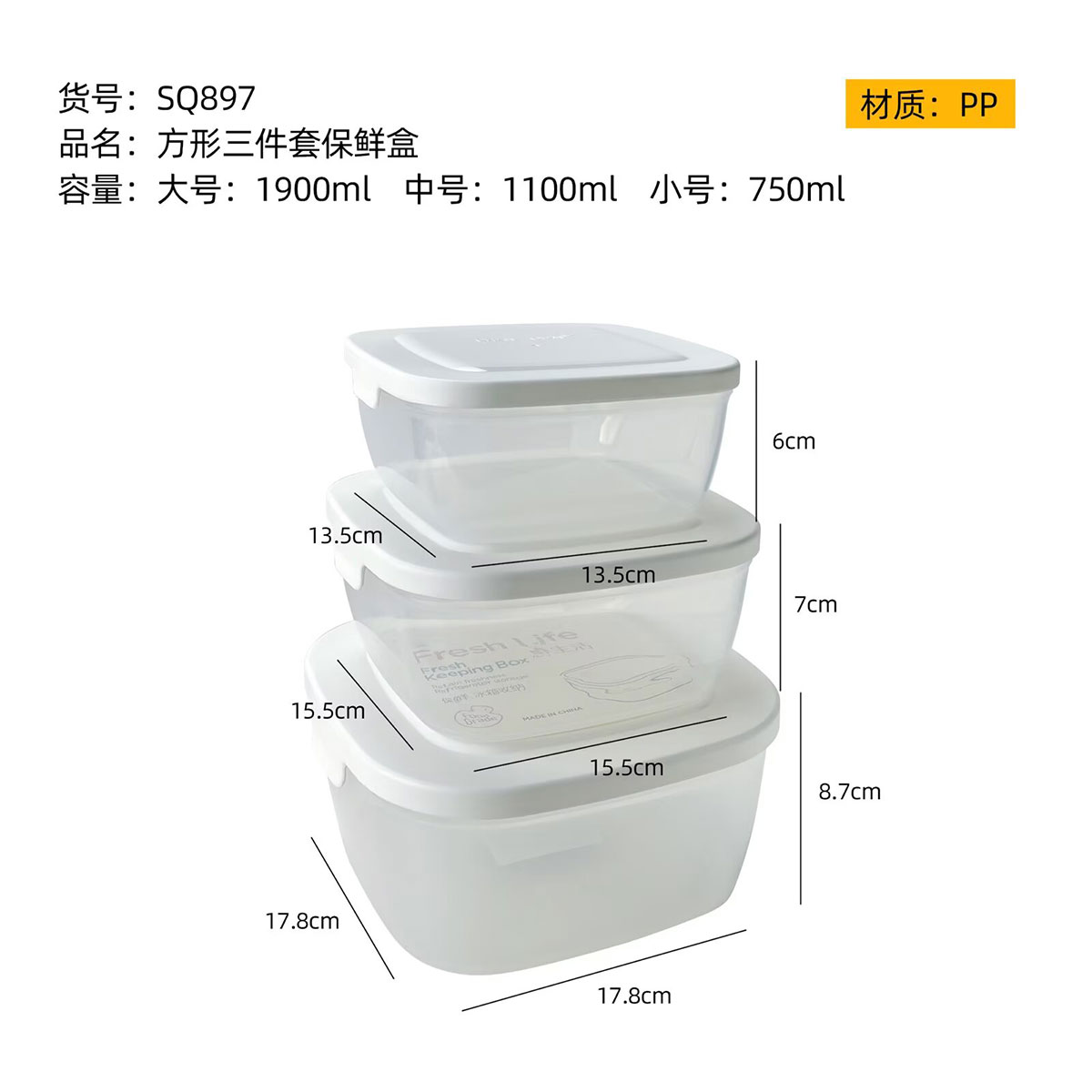 SQ-897(三件套):小號:135*135*60mm/750ml 中號:155*155*70mm/1100ml 大號:178*178*87mm/1900ml