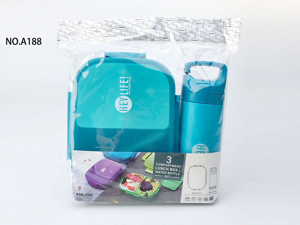 紋彩密封3格飯盒+水壺OPP袋/PVC袋套裝(長(zhǎng)方形900+350ml)