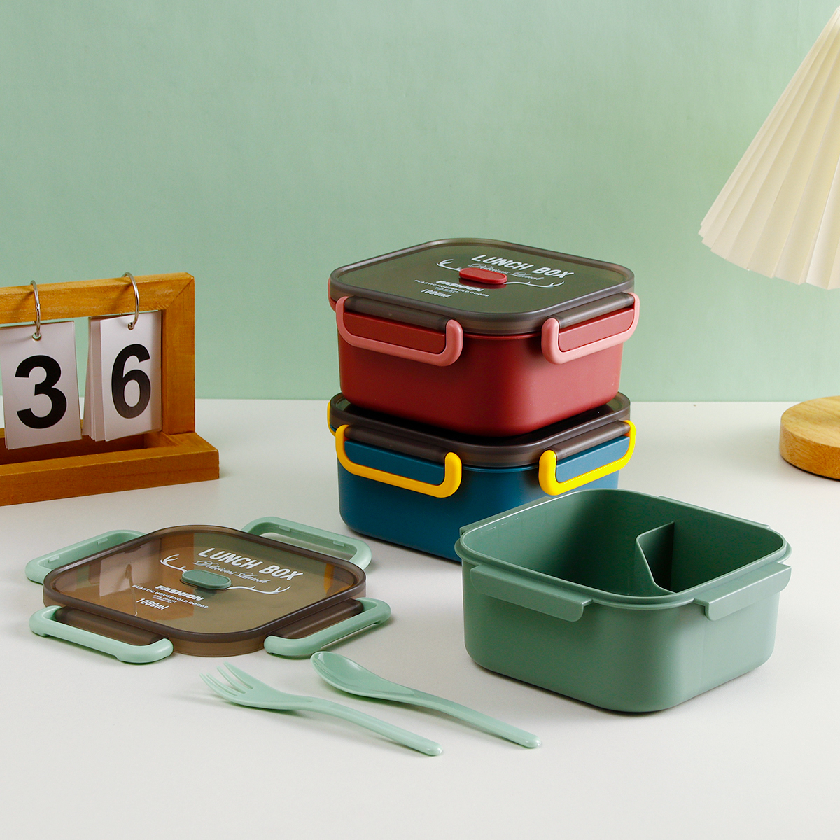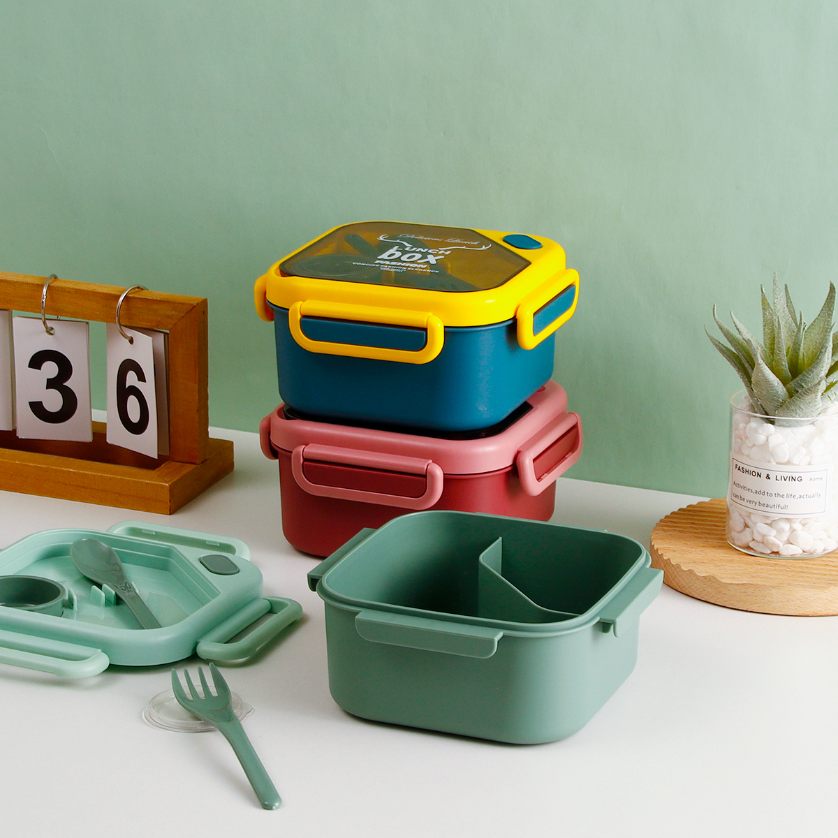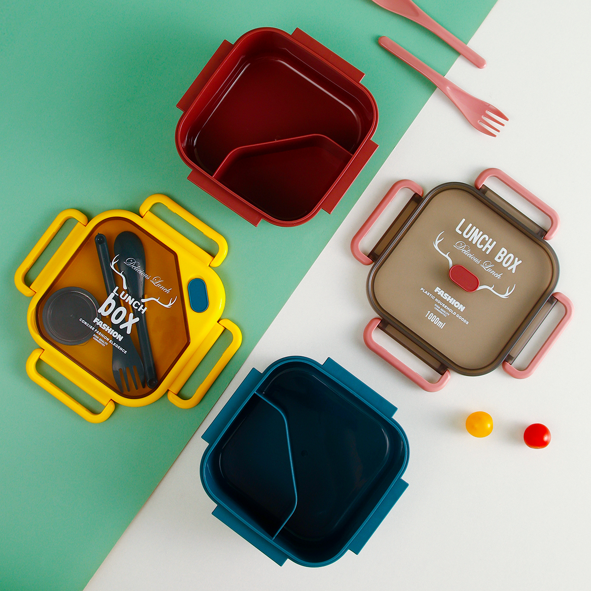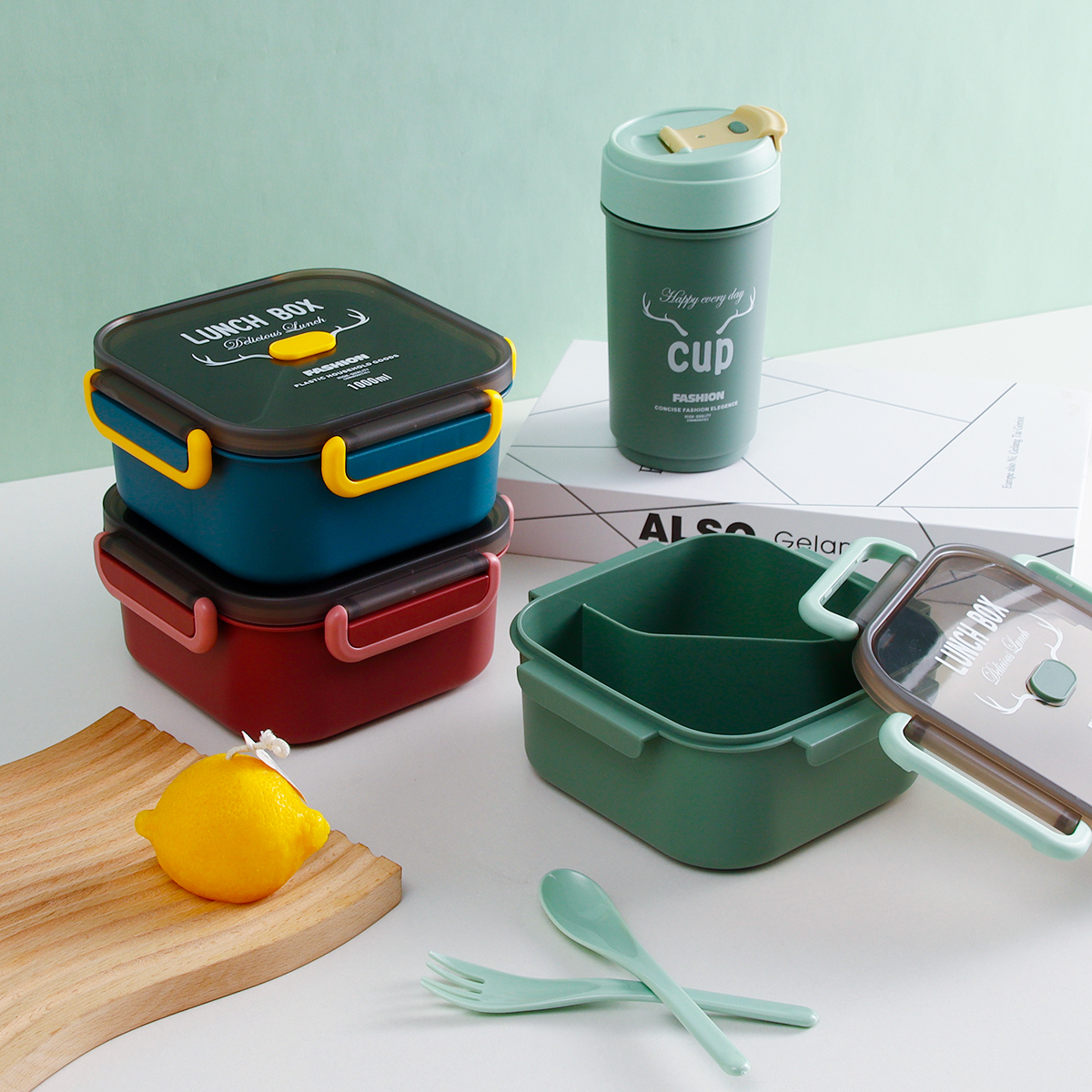 品悅正方單層分格/單層分格(含醬料盒)密封飯盒+圓形/八角隨行杯