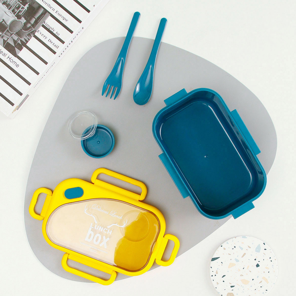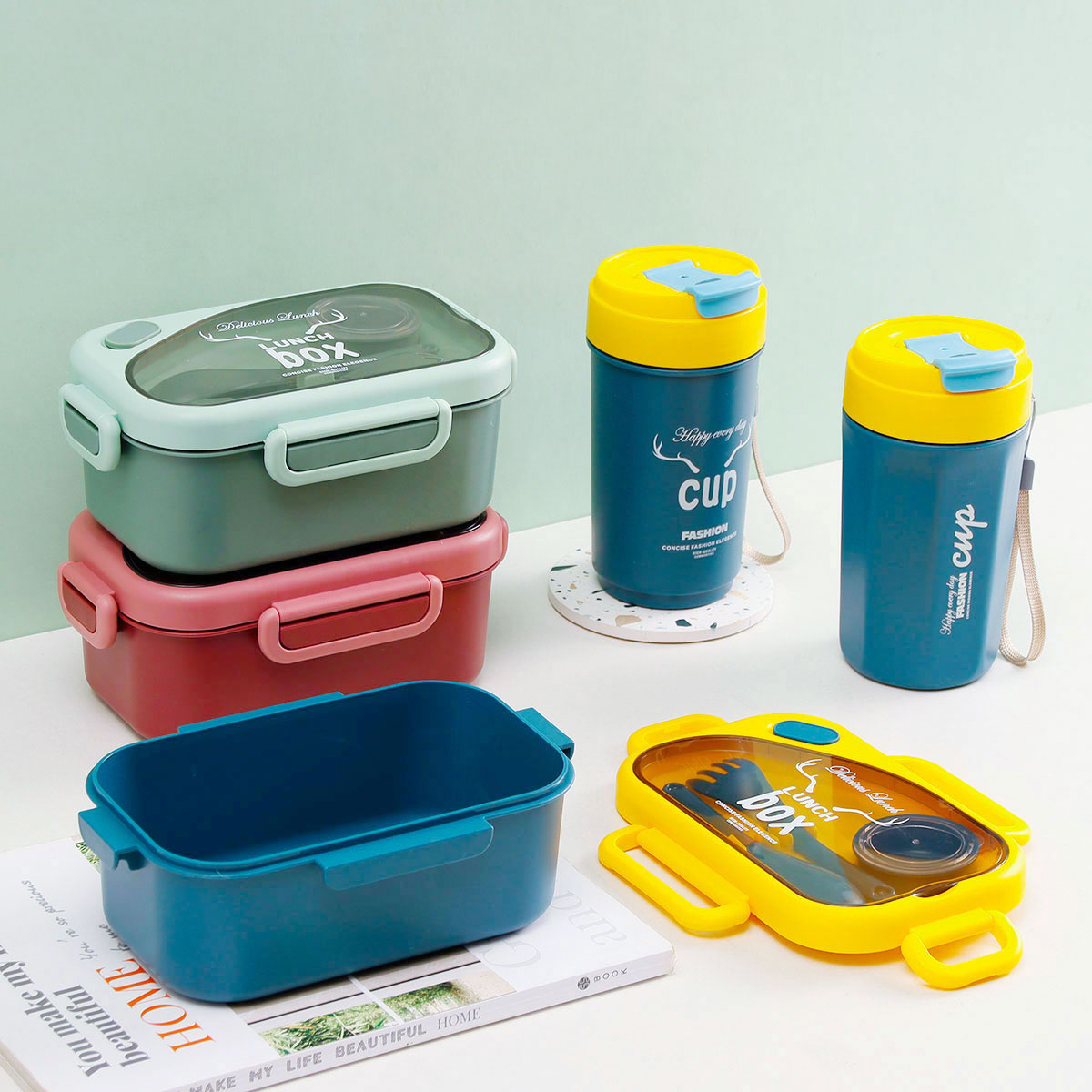 品悅長方單層密封飯盒(1000ml)(含醬料盒)+圓形/八角隨行杯(500ml)