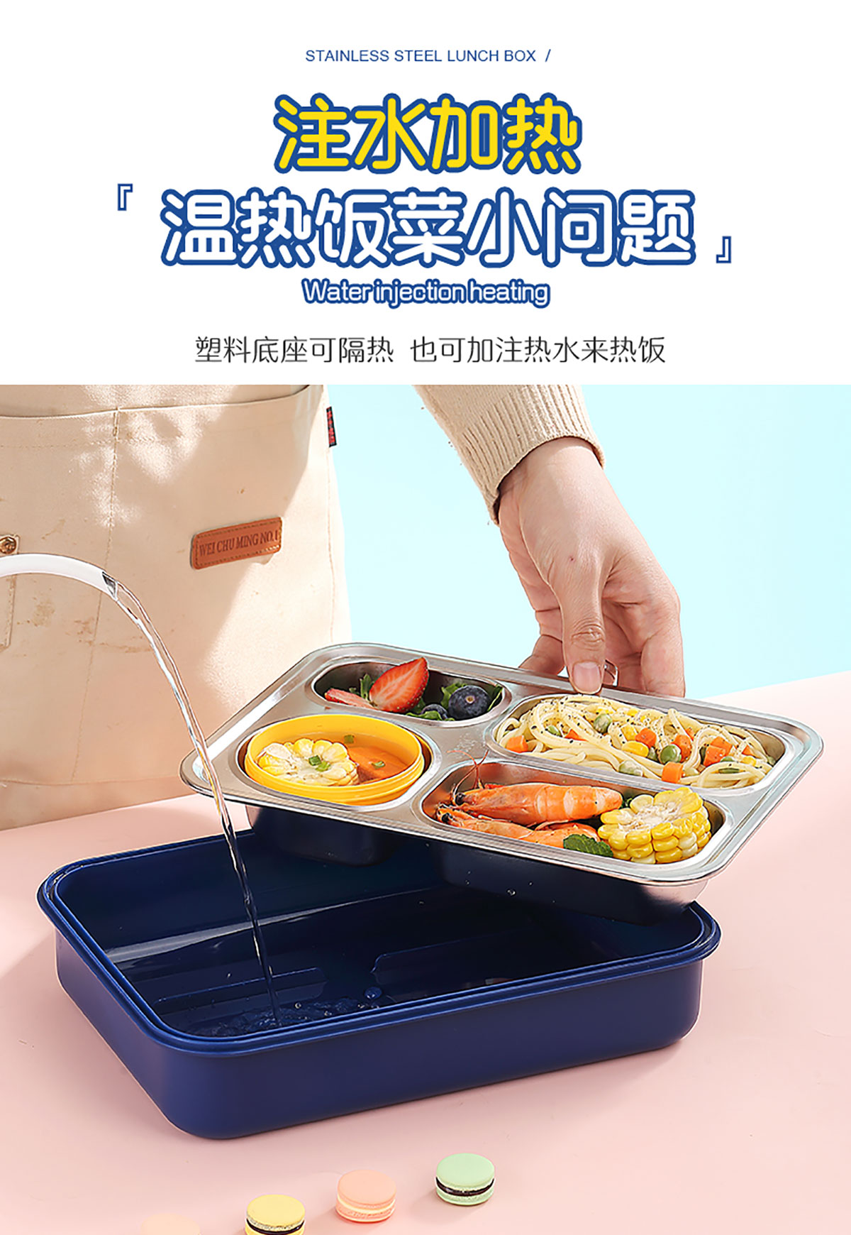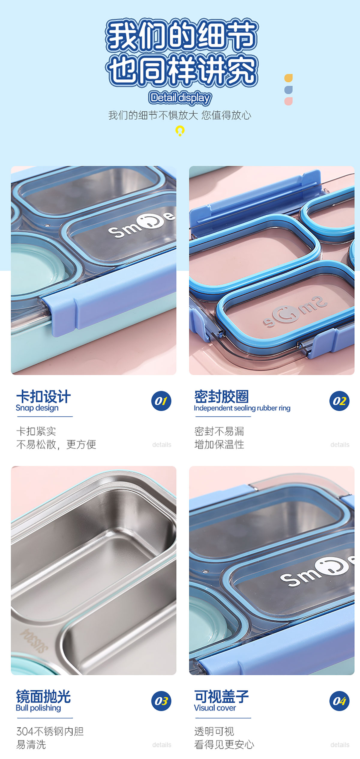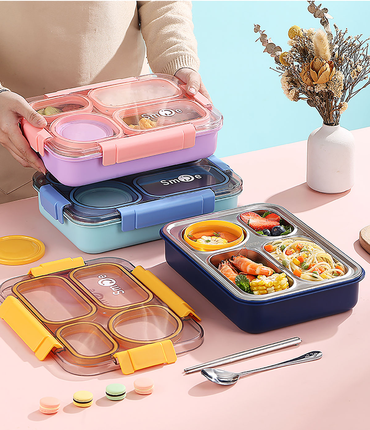 900ml獨立密封不銹鋼餐盒(4格+PP碗150ml+不銹鋼勺筷)