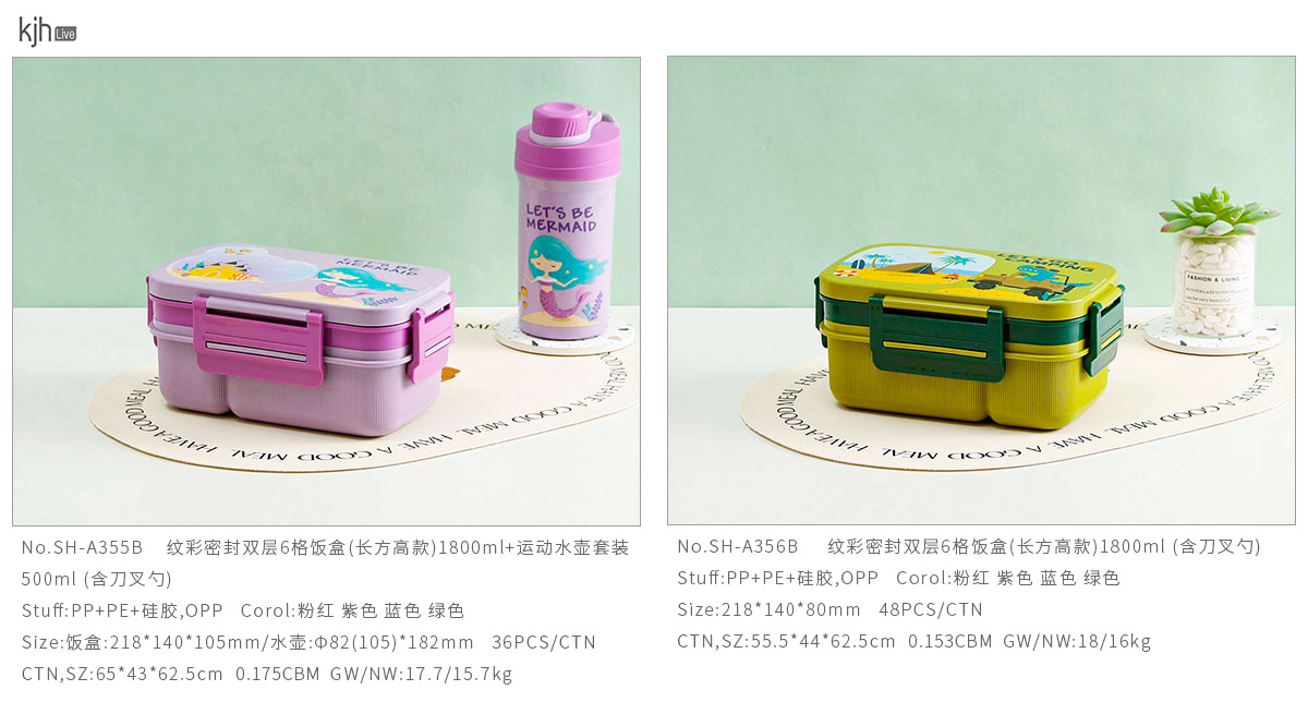 Size: SH-A355B(套裝):飯盒:218*140*105mm/水壺:Φ82(105)*182mm SH-A356B(單個):218*140*105mm
