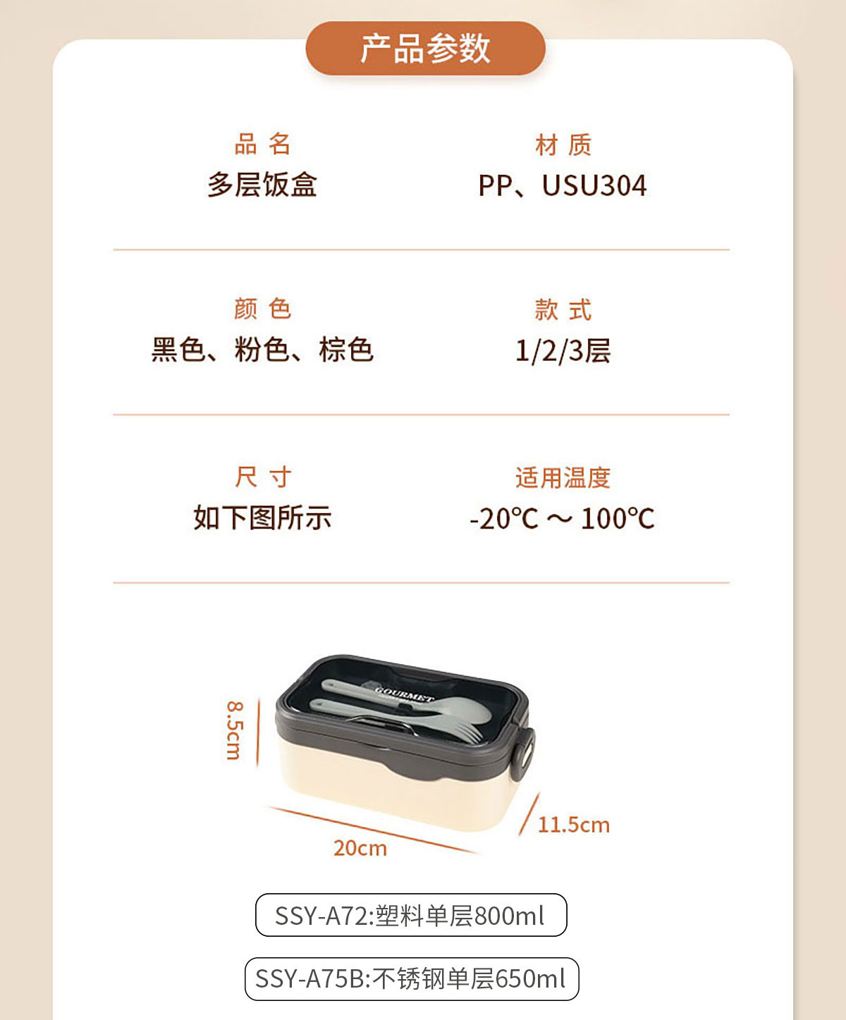 SSY-A75B(不銹鋼單層):200*115*85mm/650ml