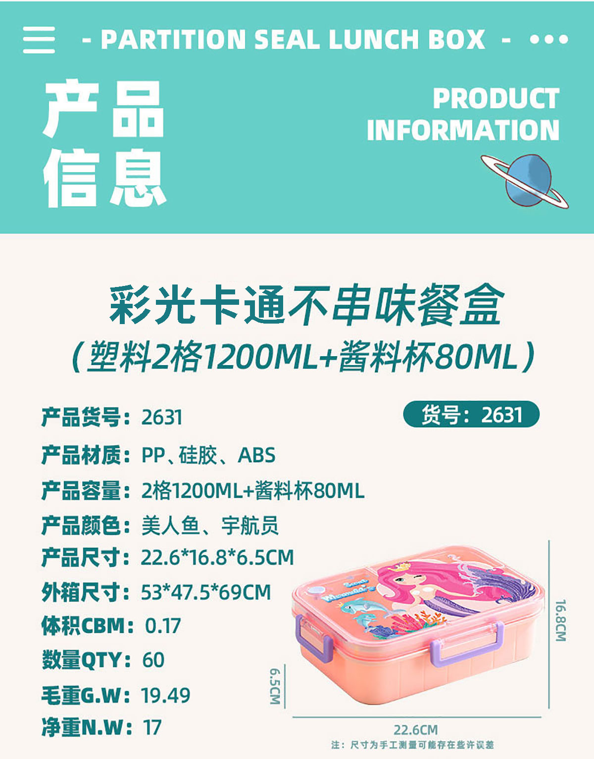 Size: AQX-2631:226*168*65mm/塑料2格1200ml+醬料杯80ml AQX-2632:226*168*65mm/塑料3格1200ml+醬料杯80ml