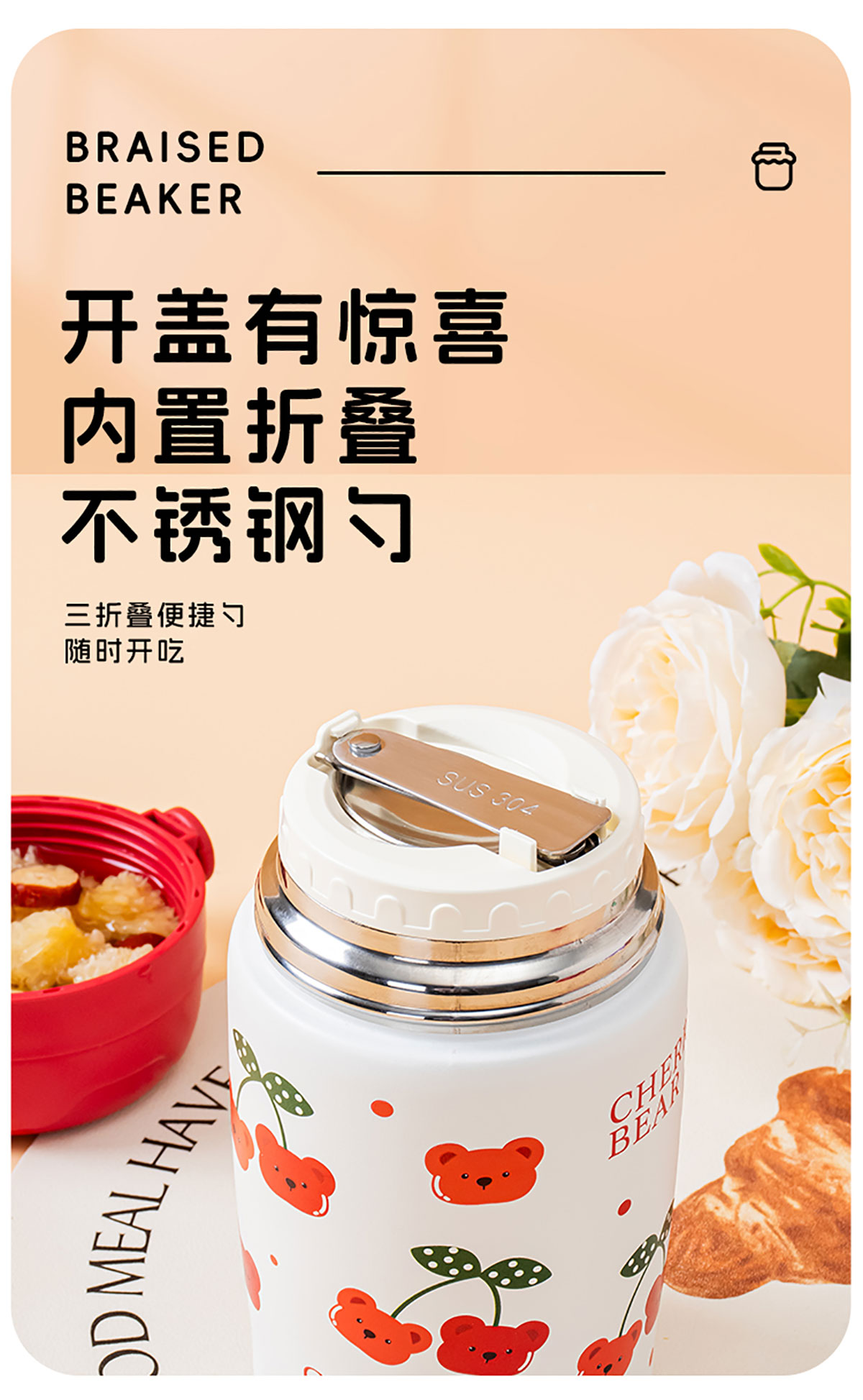 Stuff:JQ-3014/JQ-3015:PP+杯身/勺子304不銹鋼+底部316不銹鋼+硅膠/彩盒,JQ-3016/JQ-3017:PP+杯身316不銹鋼+勺子304不銹鋼+硅膠/彩盒