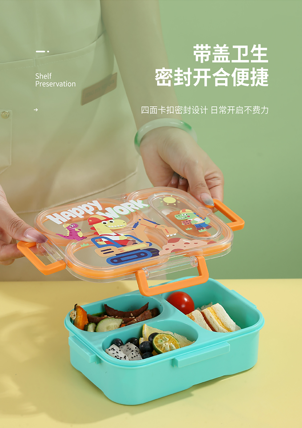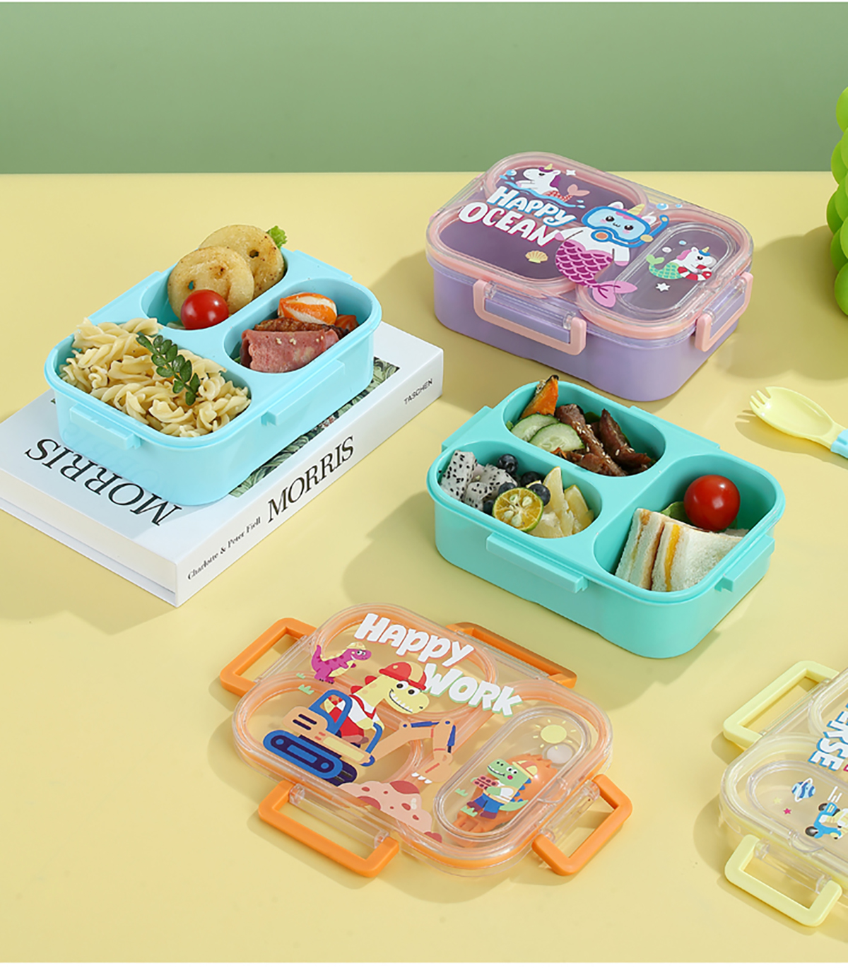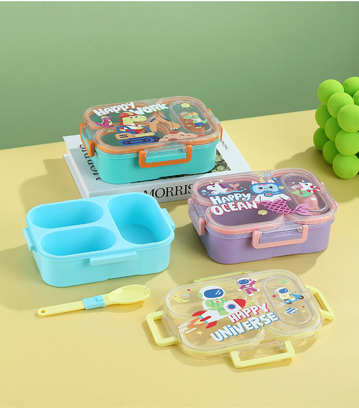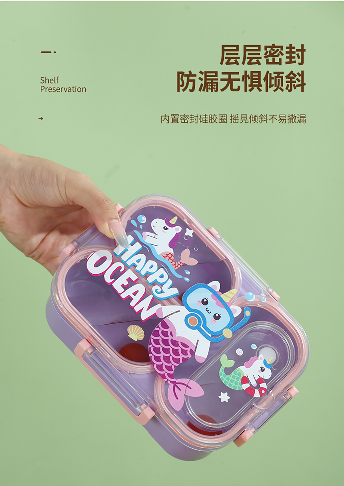 UV獨(dú)立密封卡通塑料餐盒2格900ml/3格850ml(配PP折疊湯勺)