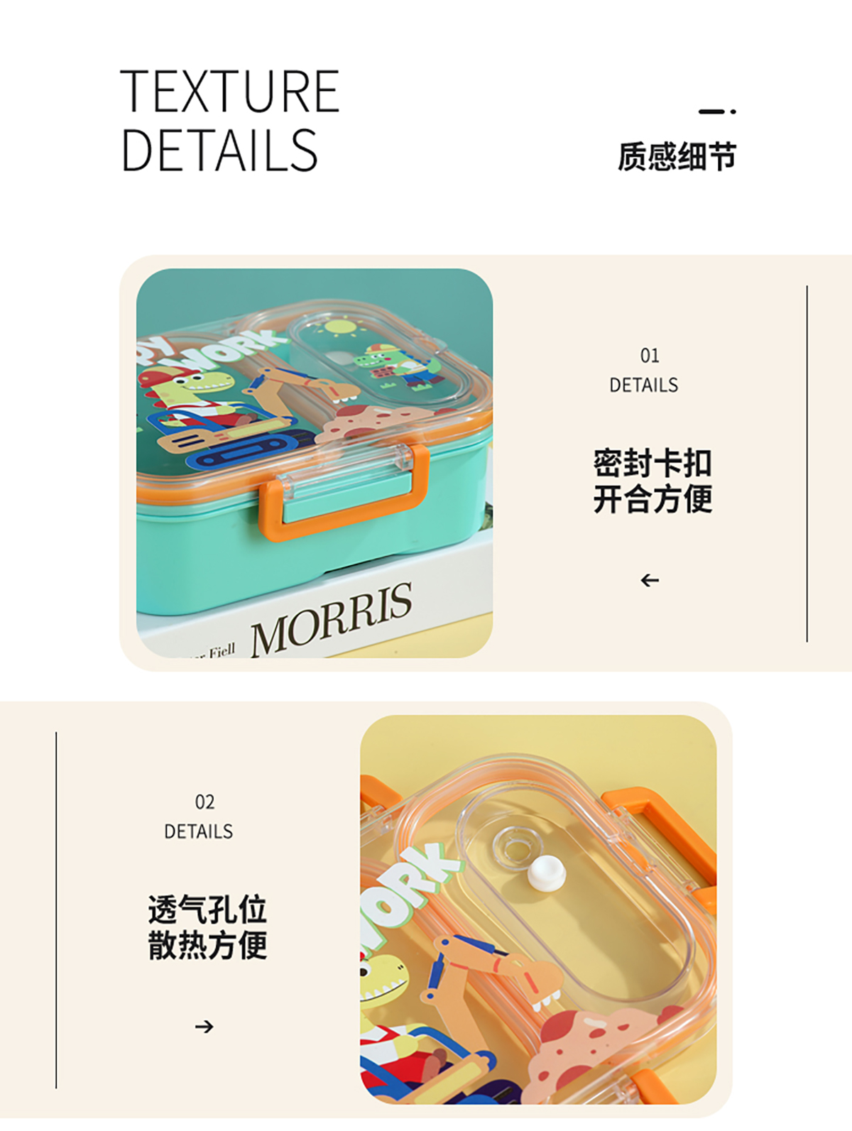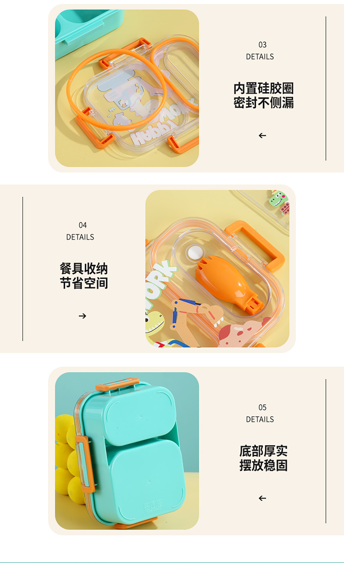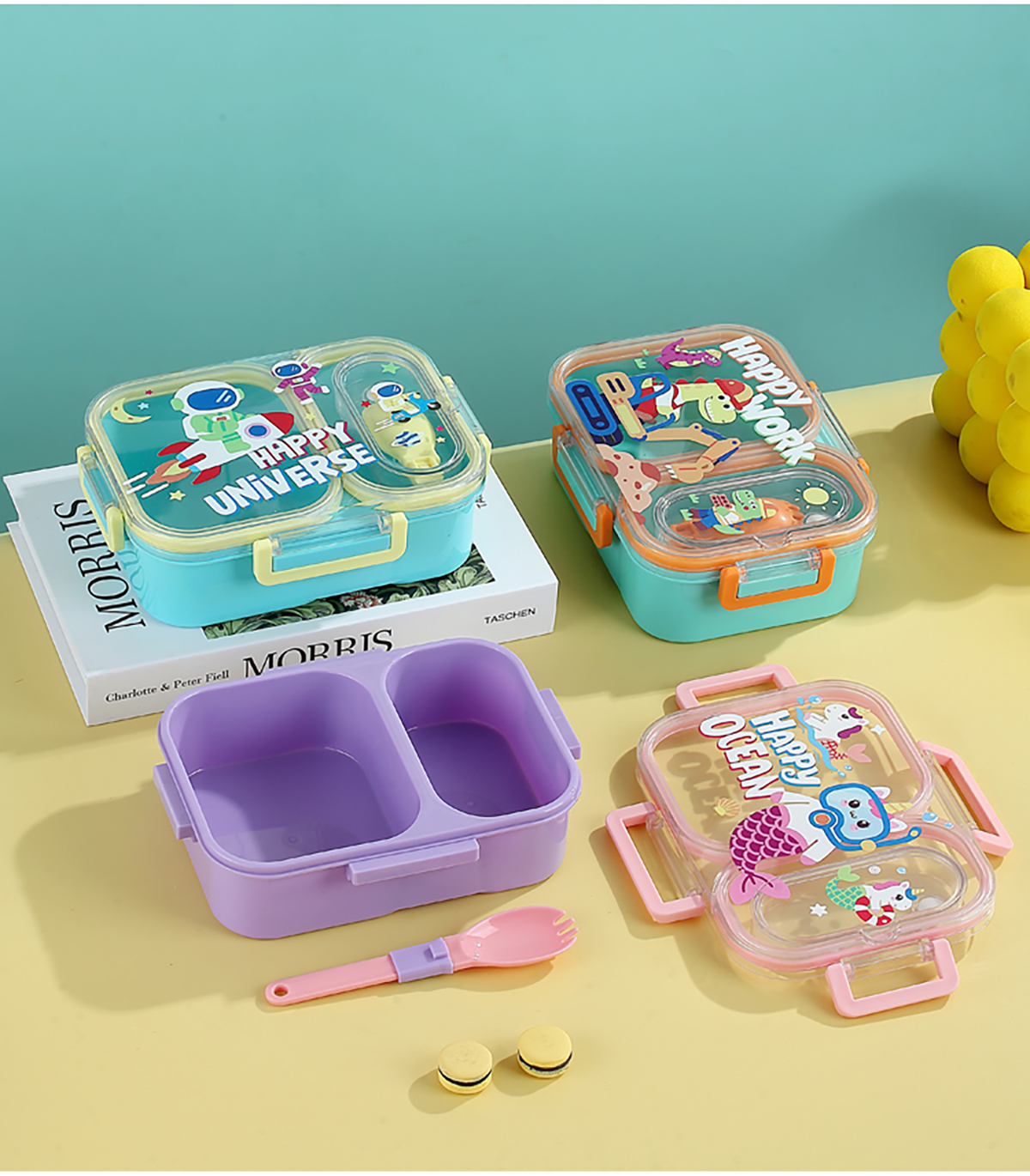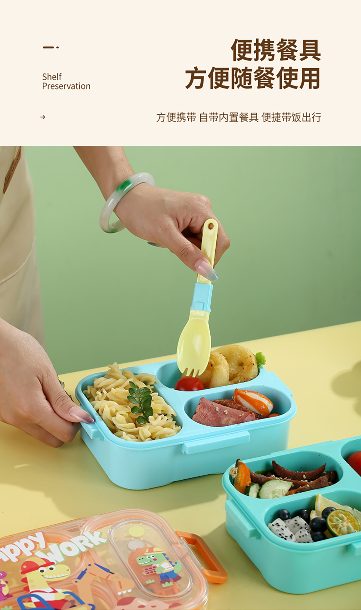 UV獨(dú)立密封卡通塑料餐盒2格900ml/3格850ml(配PP折疊湯勺)