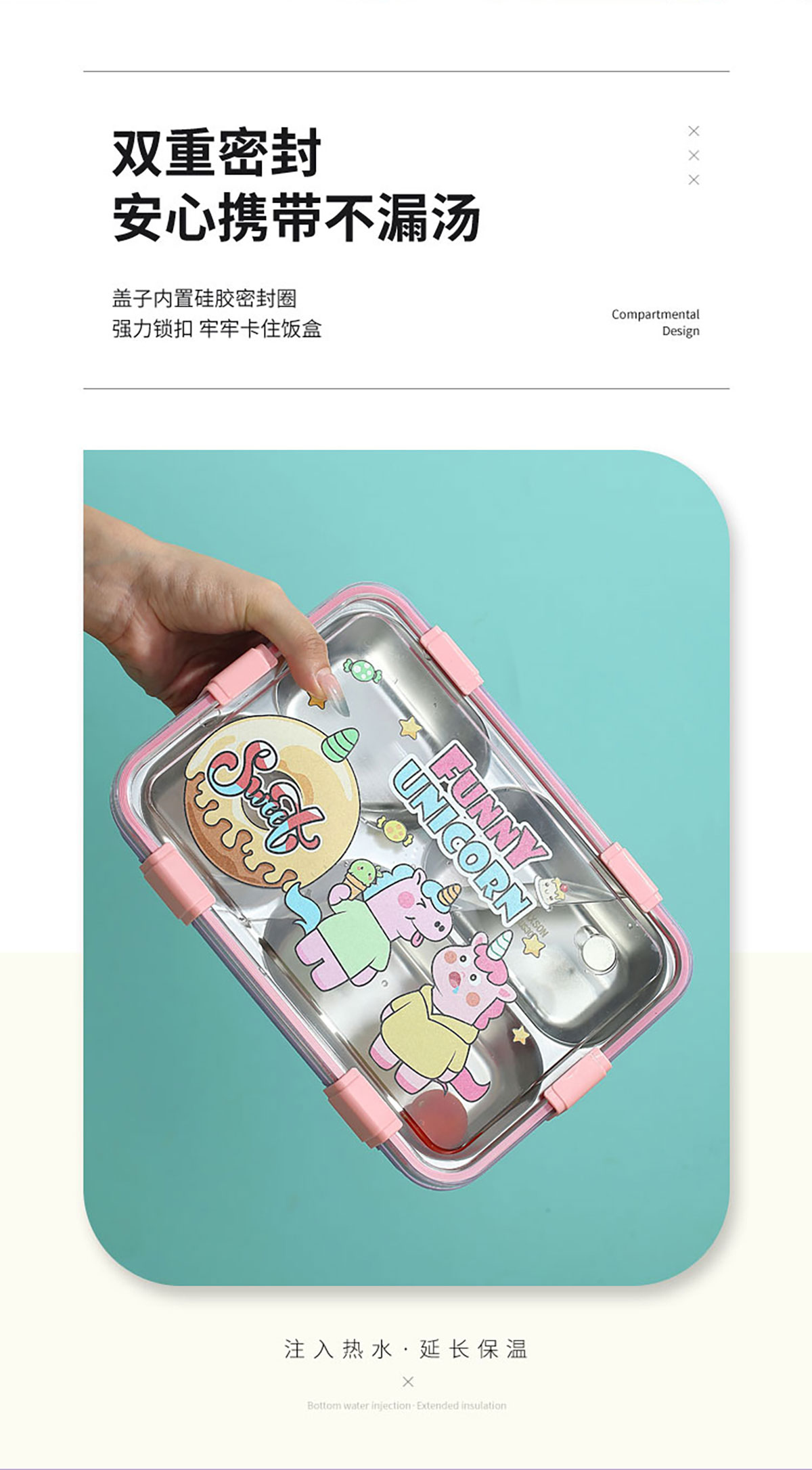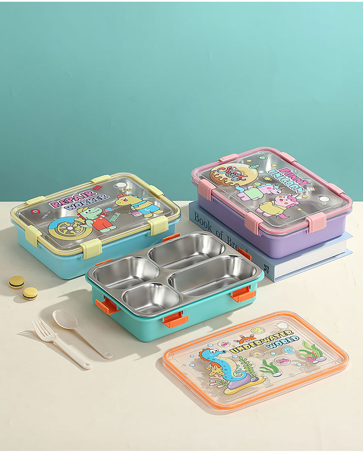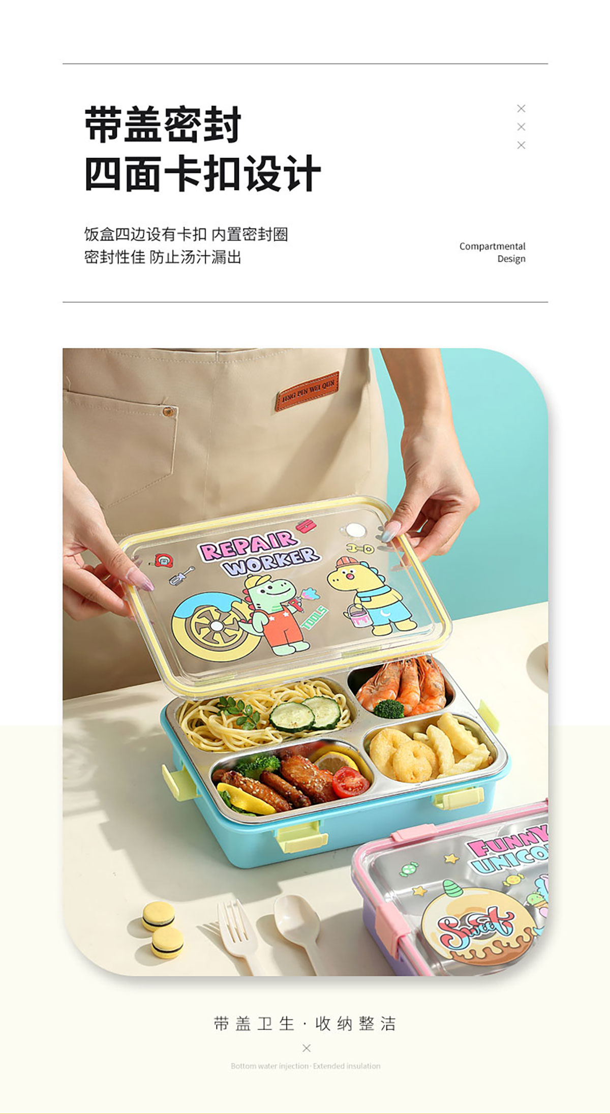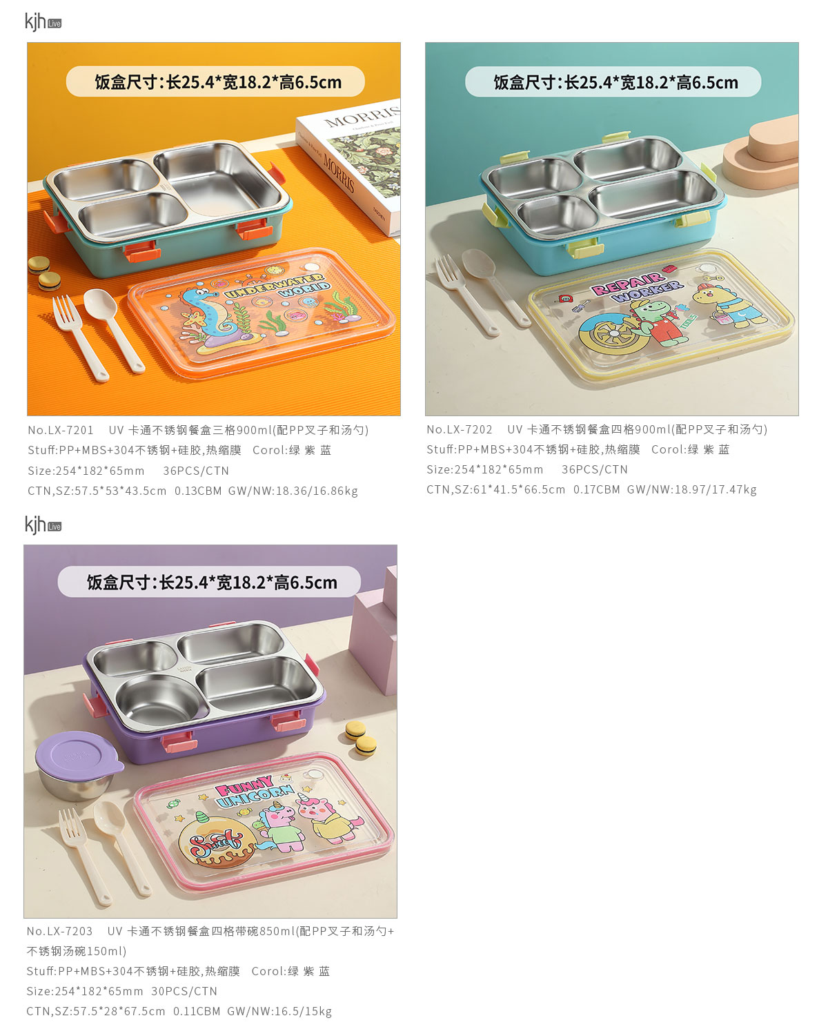 UV 卡通不銹鋼餐盒三格/四格/四格帶碗(配PP叉子和湯勺)