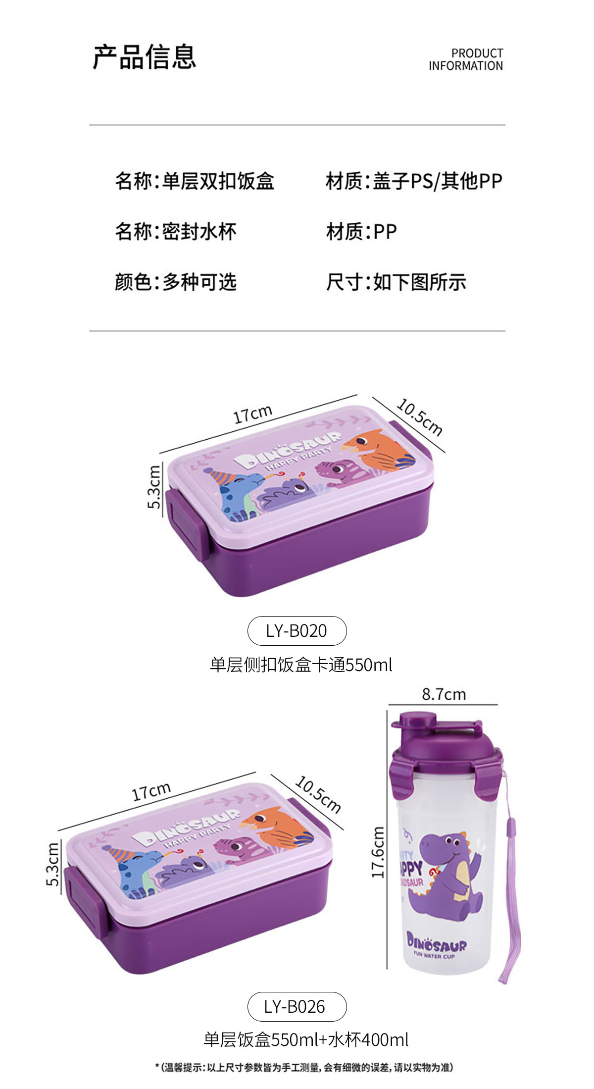 Size: LY-B020(飯盒):170*105*53mm/550ml LY-B026(飯盒+水杯):170*105*53mm/550ml 87*176mm/400ml
