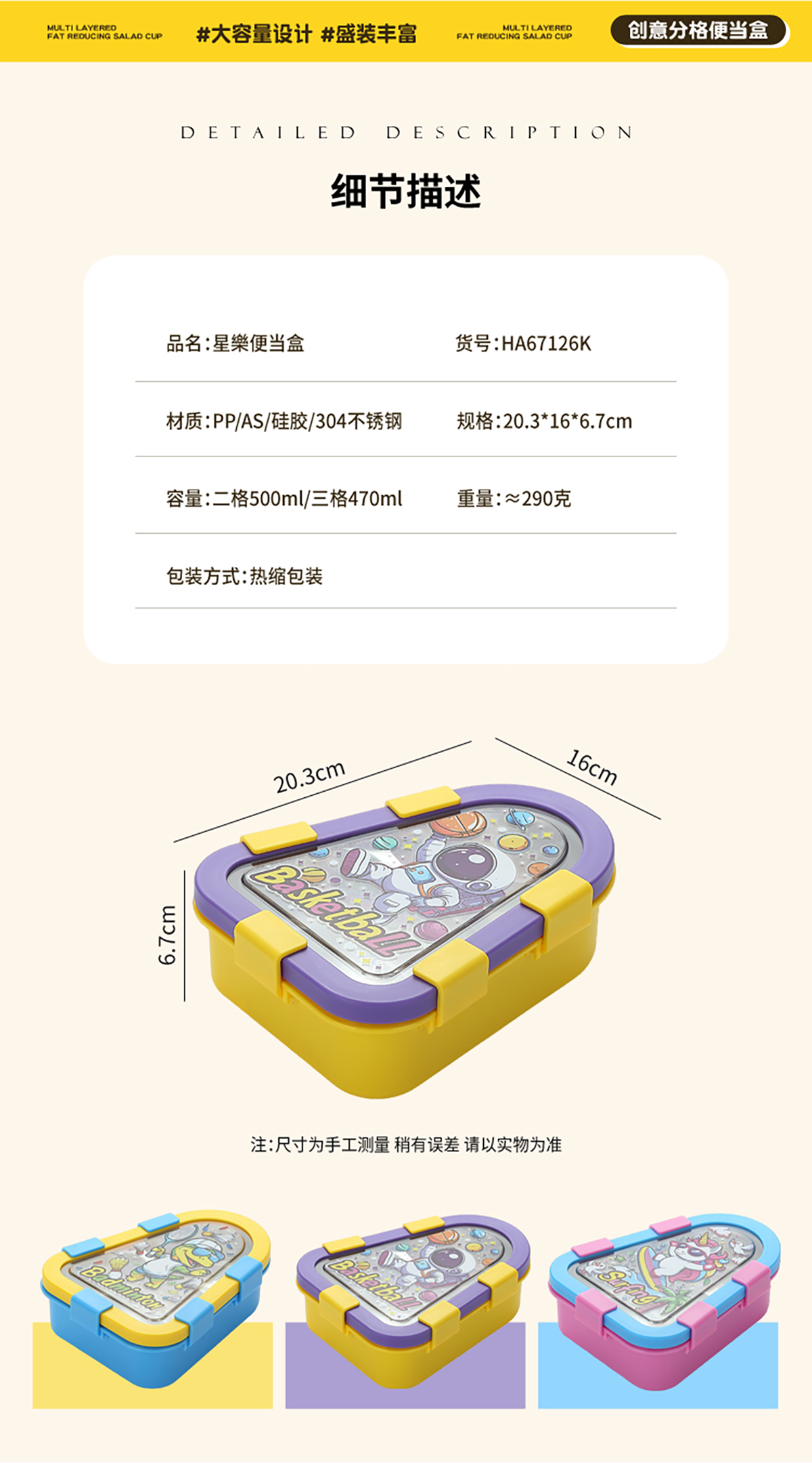 Size: 203*160*167mm(二格500ml/三格470ml)